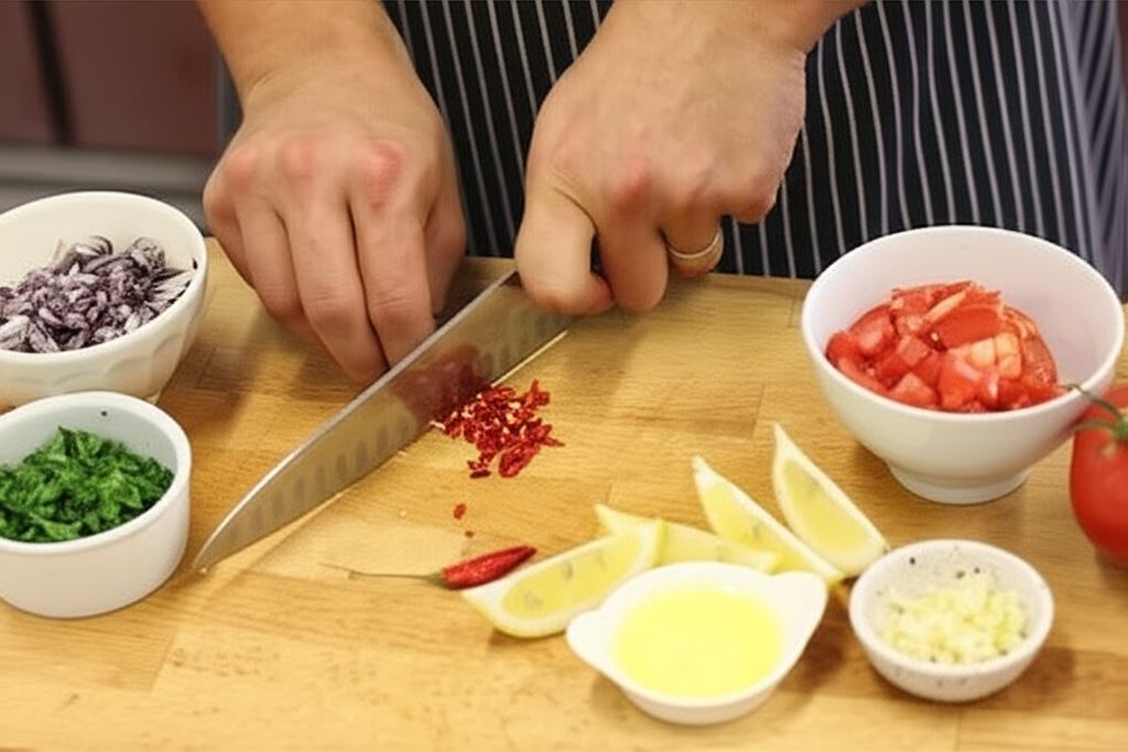 Posiekaj kolendrę, czosnek i chili, cebule oraz pomidory pokrój w kostkę. Cytrynę przekrój na pół, z jednej połowy wyciśnij sok, drugą podziel na cztery części, po czym pokrój w cienkie plasterki.