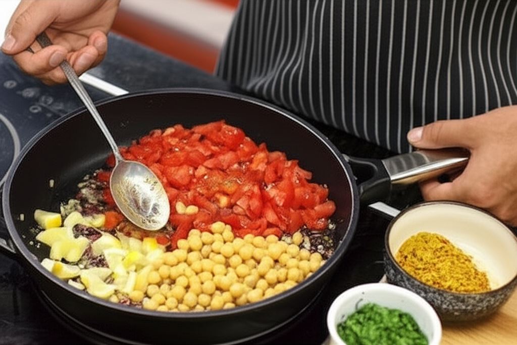W garnku albo na patelni na następnej porcji rozgrzanej oliwy zrumień czosnek, chili, cebule, cytrynę, wsyp pomidory, ciecierzycę z puszki, natkę kolendry, kmin rzymski i resztę przyprawy Knorr.