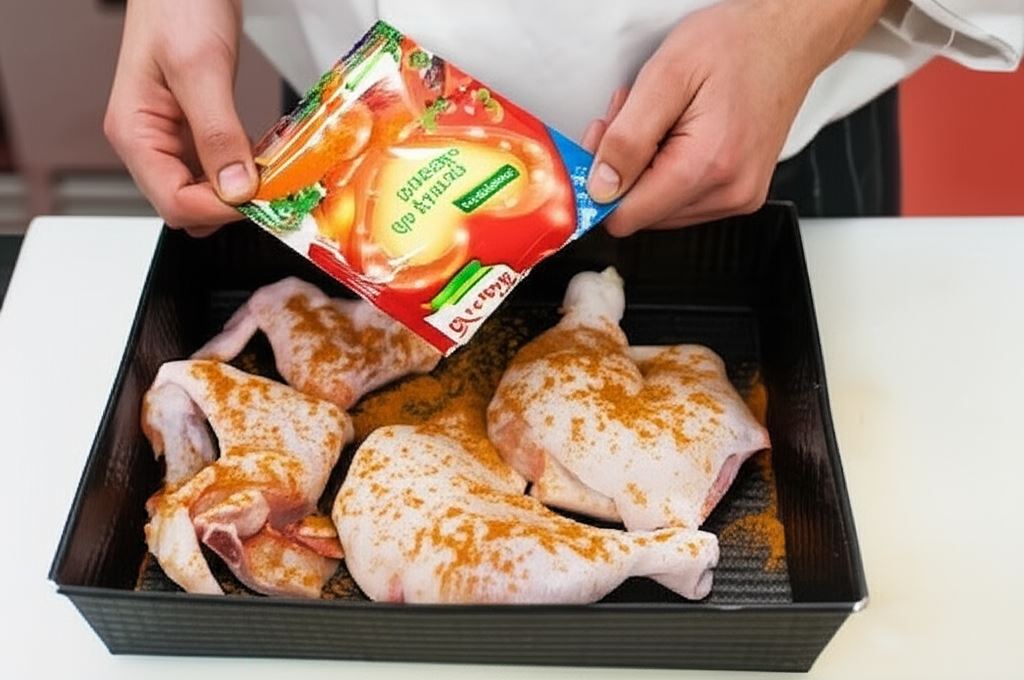 Mięso potnij na drobniejsze części. Posyp przyprawą do kurczaka Knorr i ułóż na blasze. Piecz w piekarniku rozgrzanym do 200 °C przez 40 minut. W połowie czasu pieczenia dolej szklankę wody.