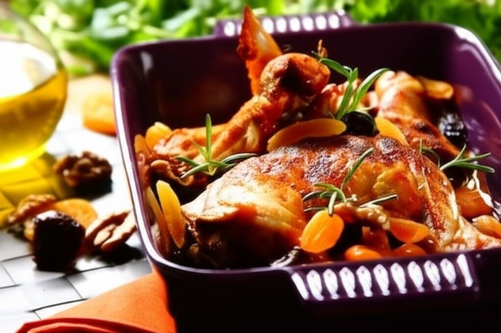 Delikatne mięso drobiowe spotyka się z wyrazistymi, słodko-kwaśnymi nutami suszonych owoców w tym wyjątkowym daniu. Pieczony kurczak po królewsku to prawdziwa uczta dla podniebienia, gdzie soczyste kawałki mięsa skąpane są w aromatycznym, gęstym sosie z dodatkiem suszonych śliwek, moreli i fig oraz chrupiących orzechów.