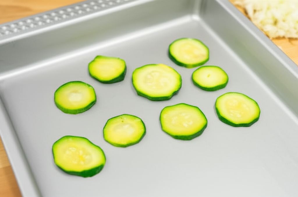 Opłukaną cukinię potnij na cienkie plastry, rozłóż na blasze plaster przy plastrze i oprósz delikatnie solą. Poczekaj kilka minut, po czym osusz je papierowym ręcznikiem. Cebulę posiekaj w drobną kostkę, ser zetrzyj na płatki.