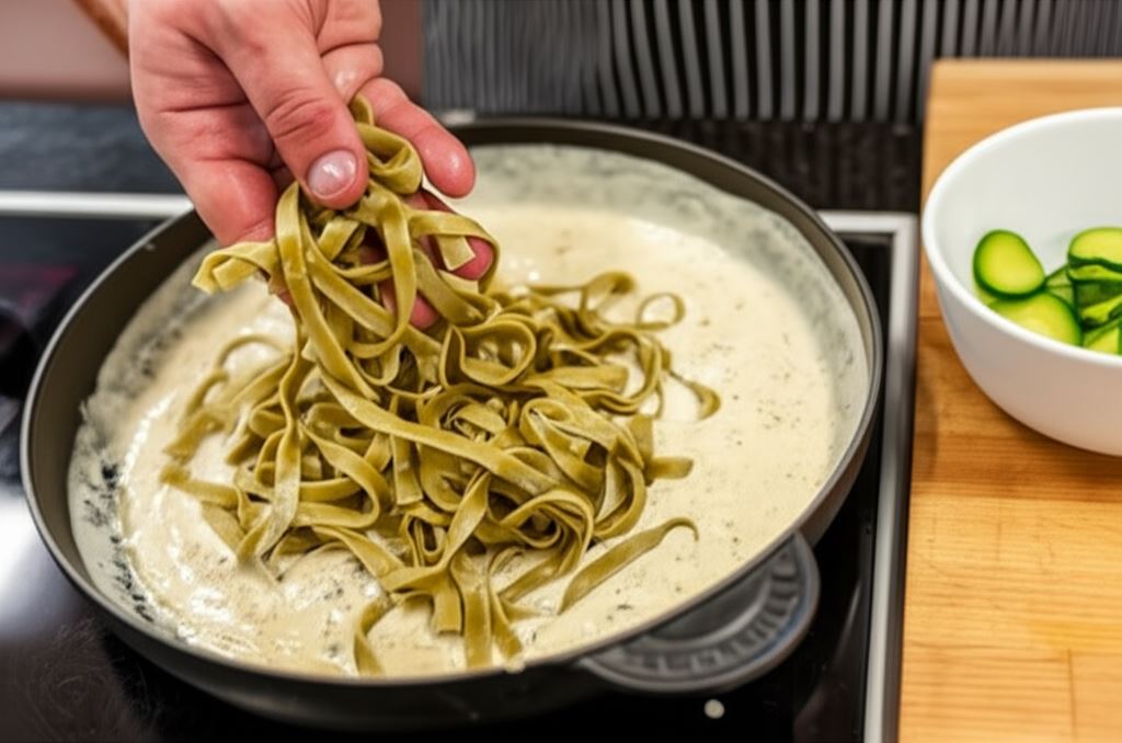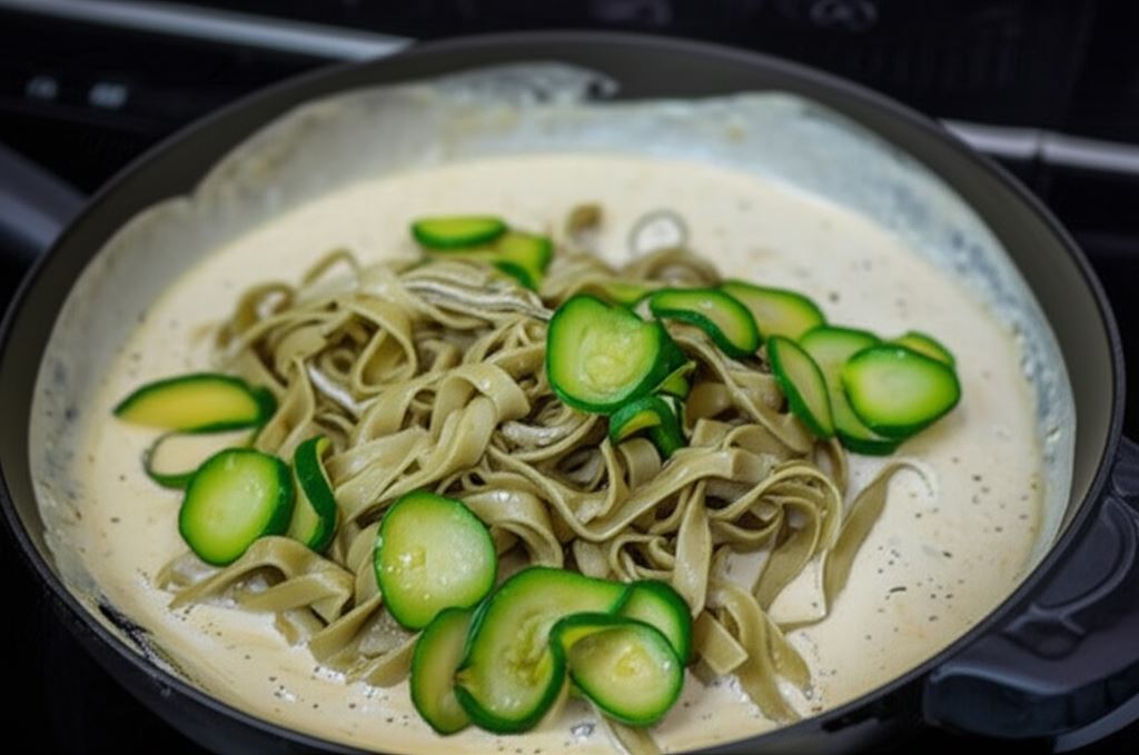 Makaron ugotuj al dente w osolonej wrzącej wodzie, odcedź. Ugotowany makaron i plastry cukinii wrzuć do sosu i doprowadź do wrzenia.