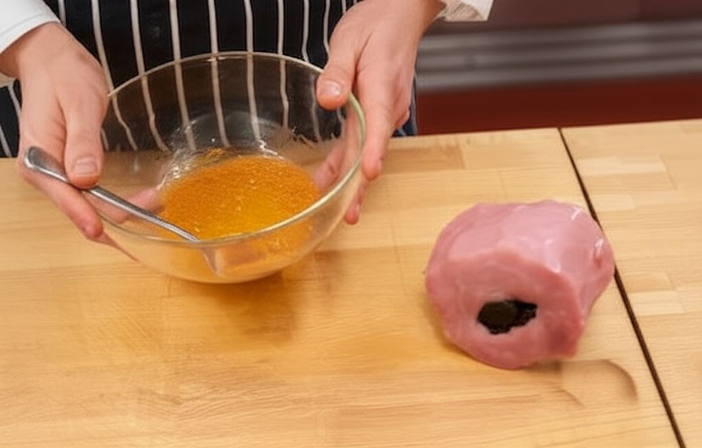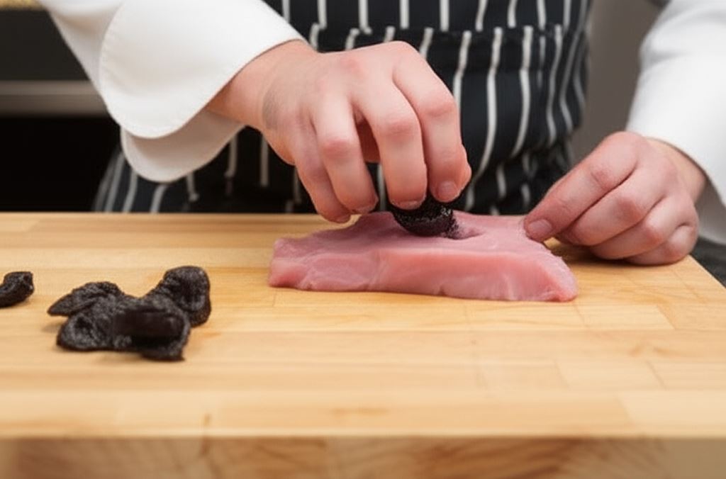 Mięso oczyść z błonek. W schabie wzdłuż całej długości na środku mięsa wykonaj nacięcie o szerokości około dwóch centymetrów. Do środka włóż suszone śliwki.