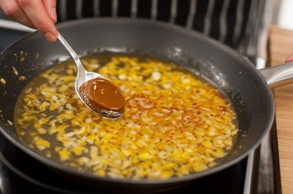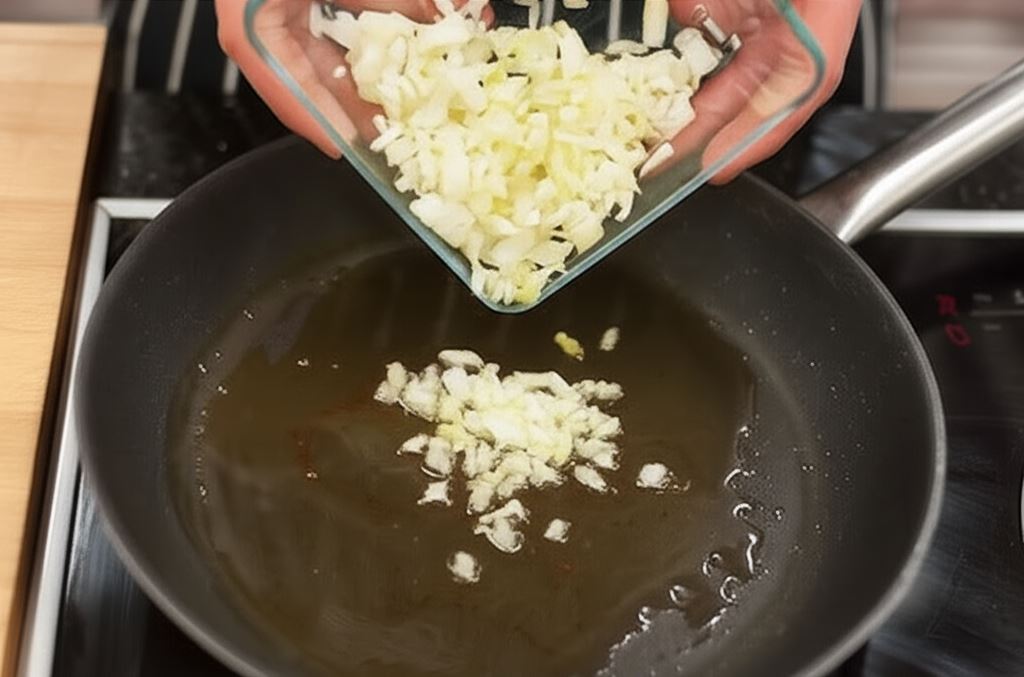 Na tej samej patelni, gdzie smażyło się mięso, na rozgrzanym tłuszczu zrumień pokrojoną w drobną kostkę cebulę.