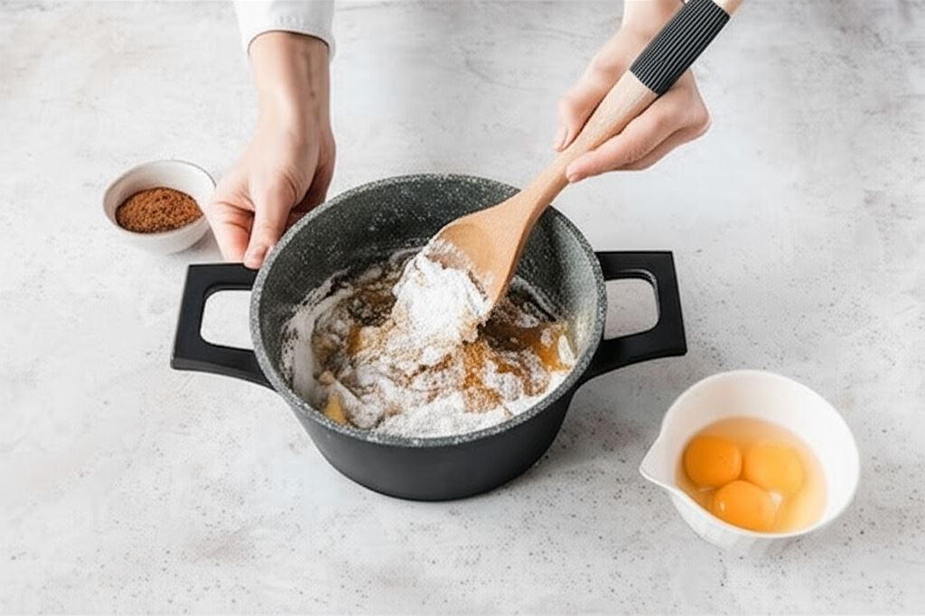 Do masy wsypujemy mąkę, jedno jajko, dwa żółtka oraz przyprawę do piernika. Całość wyrabiamy na gładkie ciasto. Na końcu dolewamy mleko zmieszane z sodą oczyszczoną.