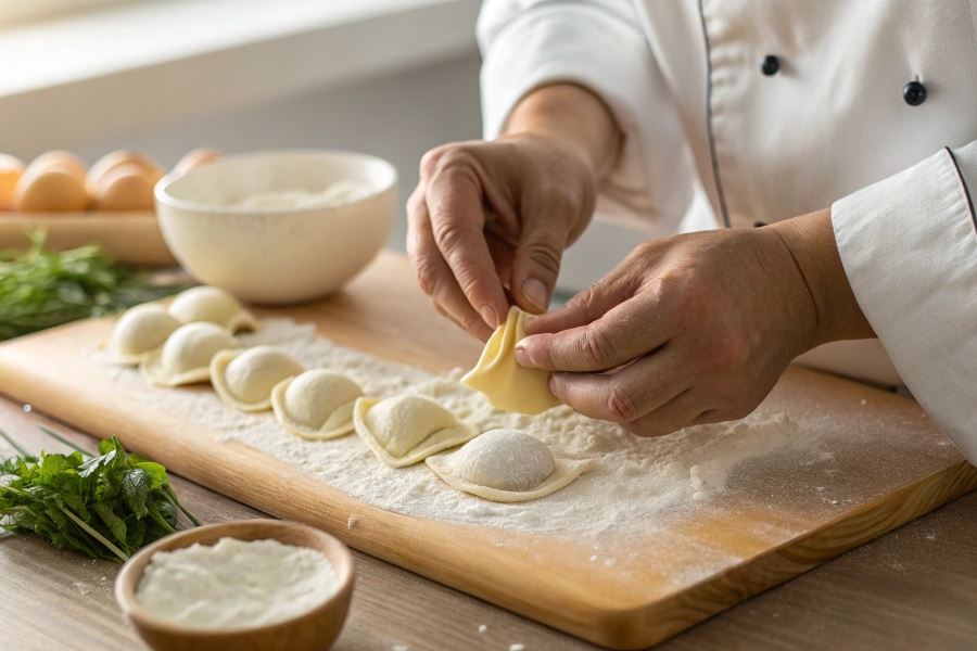 Sekret idealnego ciasta bez jajek tkwi w intensywnym wyrabianiu, które aktywuje gluten i nadaje ciastu odpowiednią strukturę. W PrimeCook stosujemy tradycyjne techniki wyrabiania, które gwarantują doskonałą teksturę naszych pielmieni.