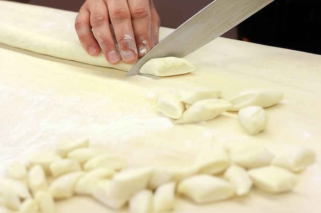 Na oprószonej mąką desce, po kolei, każdą porcję uformuj w podłużny wałeczek o średnicy 2-3 centymetrów i odkrawaj ukośnie 3 centymetrowe kluski. Potem wrzucaj na osoloną wrzącą wodę i gotuj około 3 minut od chwili wypłynięcia na powierzchnię.