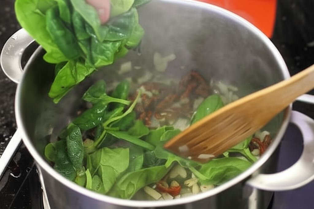 Cebulę i czosnek posiekaj na drobną kostkę, pomidory w cienkie plastry, a szpinak podrzyj na mniejsze części. Na rozgrzanej oliwie podsmażaj cebulę i czosnek, potem dodaj pomidory i szpinak. Smaż moment.