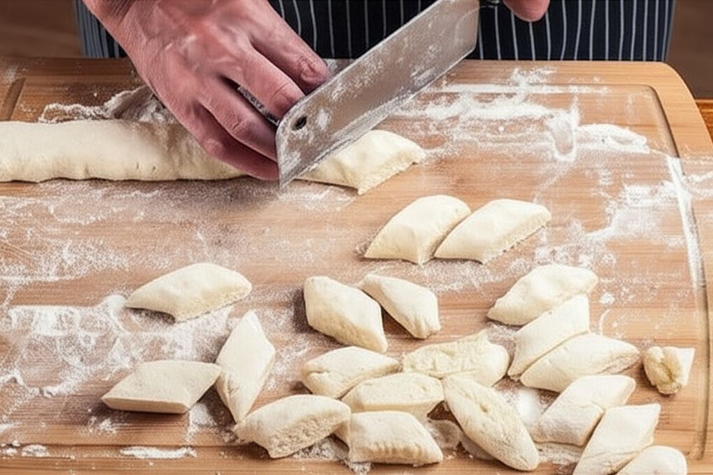 Uformuj wałeczki posypując mąką, delikatnie spłaszcz je dłonią. Potnij na rąby.