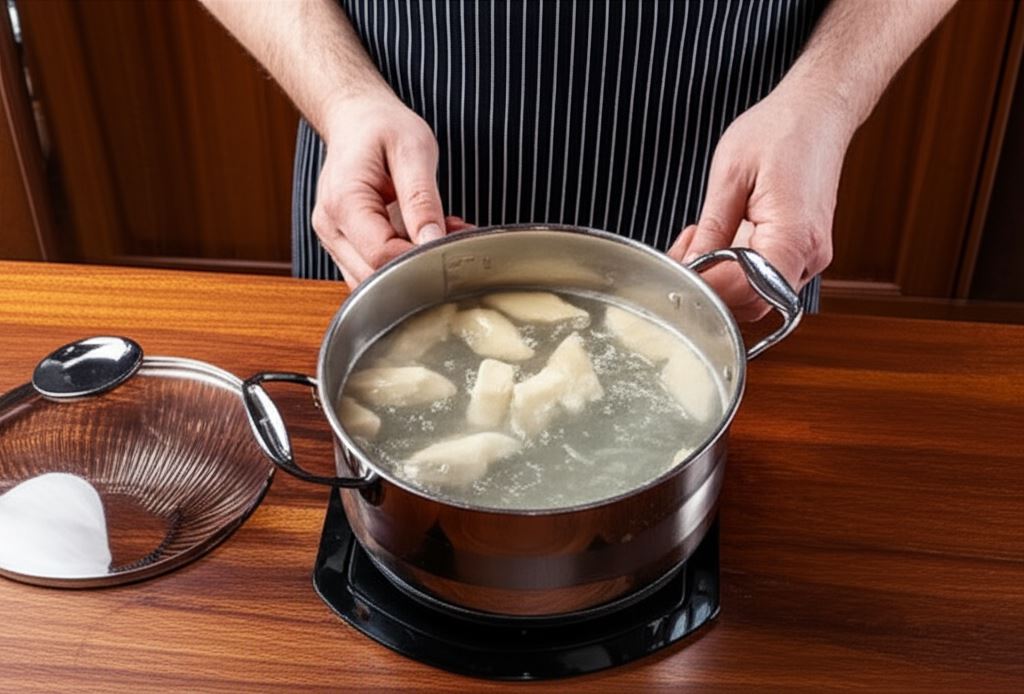 Wrzuć pierogi do wrzątku i gotuj aż wypłyną, odcedź.