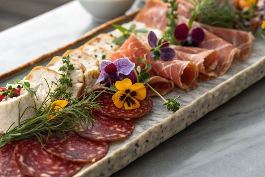 Profesjonaliści coraz częściej wykorzystują technikę wertykalną – specjalne stojaki pozwalające na układanie wędlin pionowo, co zwiększa pojemność półmiska i tworzy efektowną, trójwymiarową prezentację. Dodatkowo, czarne półmiski z łupka stanowią idealny kontrast dla kolorowych wędlin, podkreślając ich barwy i tekstury.