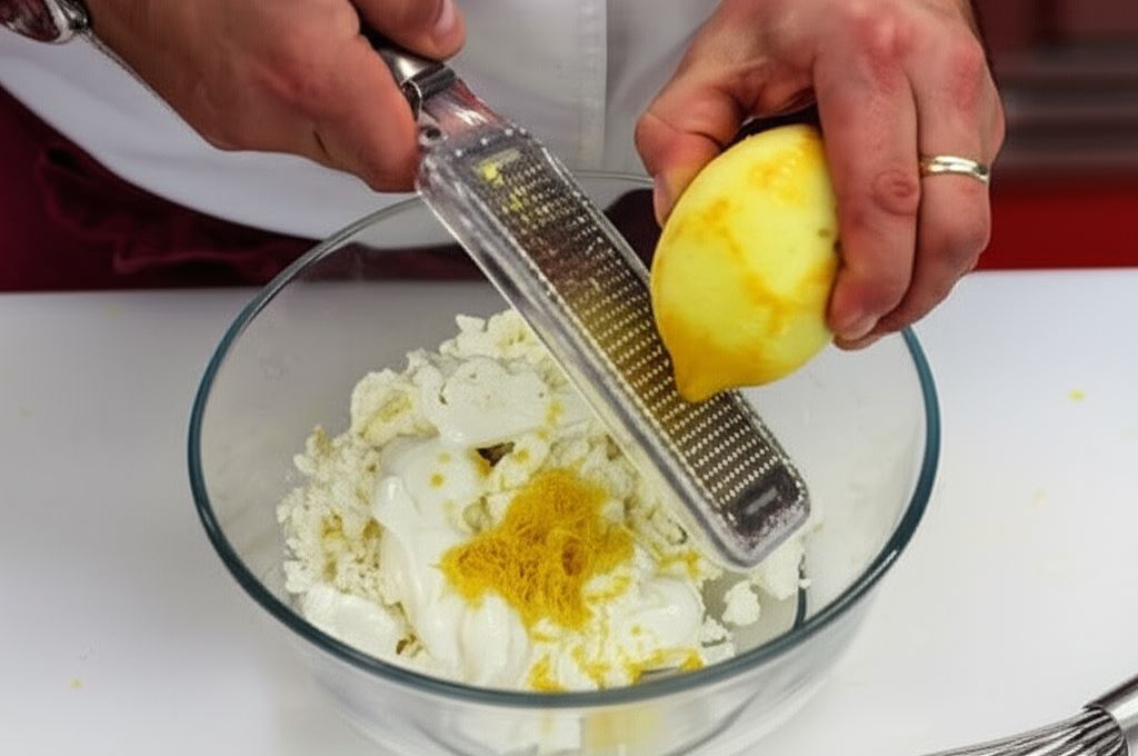 Ser wymieszaj ze śmietaną, cukrem i skórką cytrynową,
