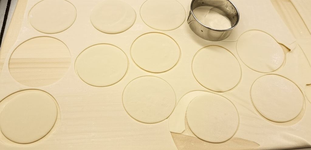 Ciasto rozwałkuj na cienki placek i wytnij okrągłe formy, na przykład przy użyciu szklanki.
