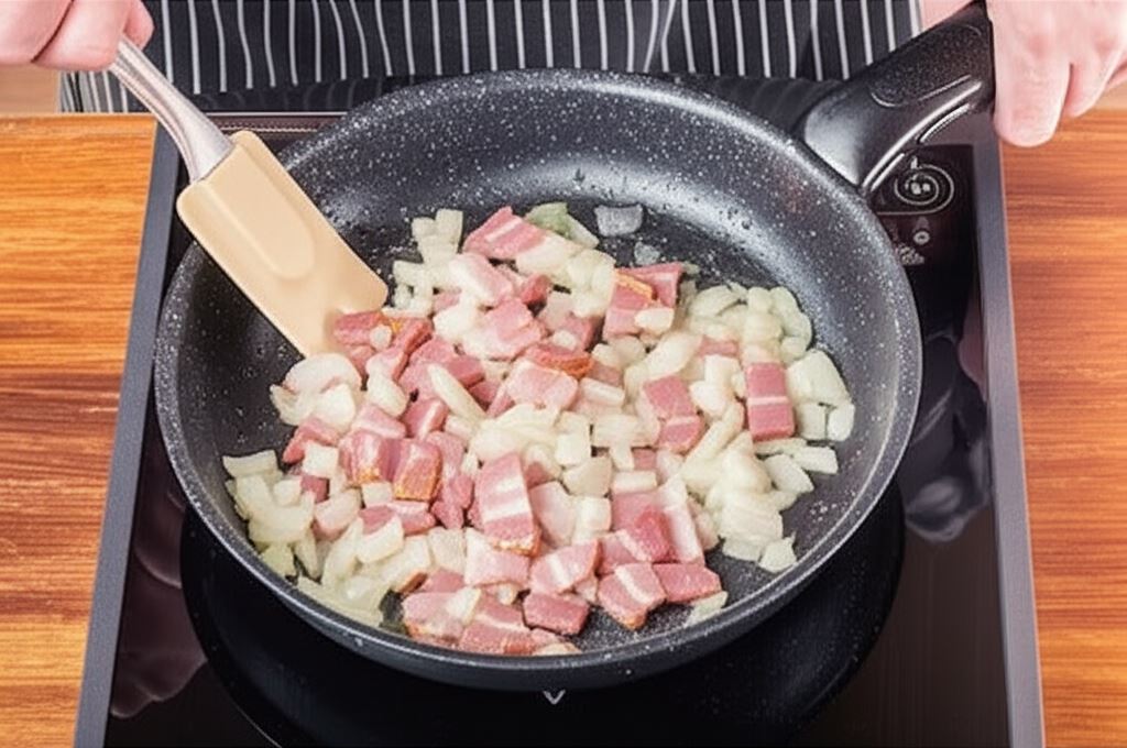 Filety ugotuj w rosole Knorr, odcedź i ostudź. Cebulę i boczek posiekaj i zrumień na maśle.