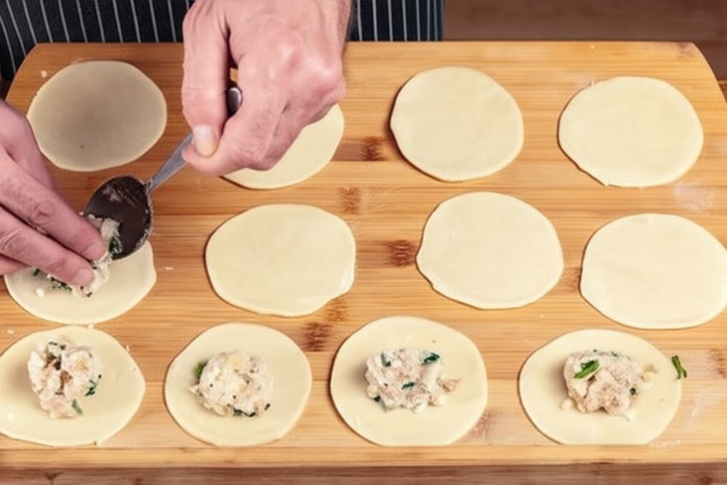 Rozwałkuj ciasto, wytnij krążki. Na każdy krążek nałóż porcję farszu i formuj pierogi.