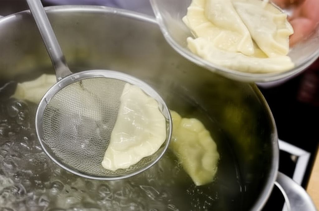 Przygotowane pierogi wrzuć do wrzącej, posolonej wody i gotuj do momentu, aż wypłyną. Ugotowane serwuj z roztopionym masłem lub usmażone.