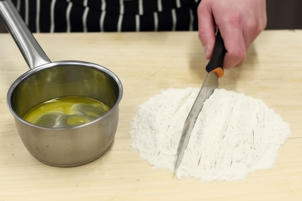 Przesiej mąkę na stolnicę i uformuj pośrodku zagłębienie. Masło roztop w wodzie. Wodę dodawaj stopniowo do mąki i wyrabiaj ciasto. Przygotowane ciasto odstaw na pół godziny.