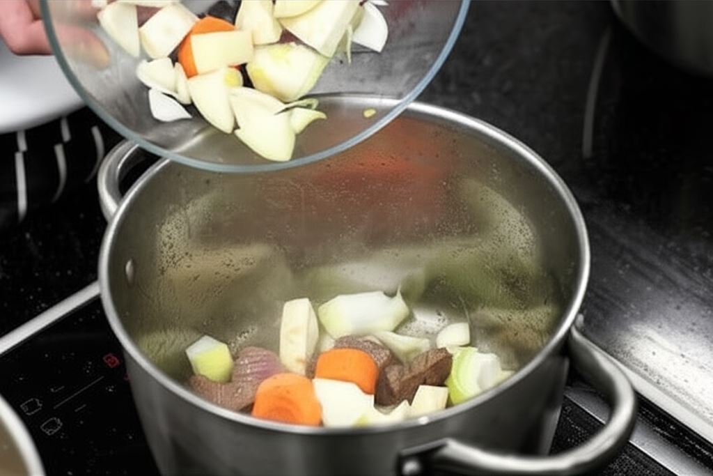 Mięso i warzywa potnij w grubą kostkę i obsmaż na oleju w garnku. Dodaj liść laurowy oraz ziele i dolej wodę – w takiej ilości, by zakryła składniki.