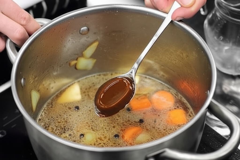 Aby farsz uzyskał pełny smak do garnka wsyp Bulionetkę wołową Knorr. Wszystko doprowadź do wrzenia, po czym zredukuj ogień. Gotuj aż mięso stanie się miękkie.