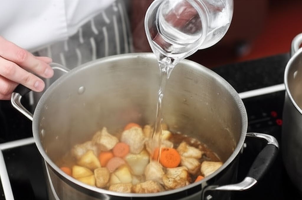 Mięso i warzywa potnij w grubą kostkę i obsmaż na oleju w garnku. Dodaj liść laurowy i ziele, następnie wlej wodę – w takiej ilości, by zakryła składniki.