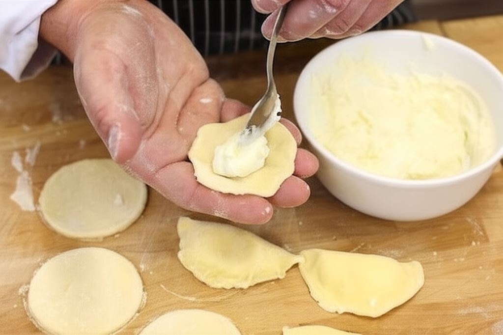 Doprowadź wodę do wrzenia w garnku, dodaj szczyptę soli i umieść pierogi we wrzątku, a kiedy wypłyną na powierzchnię ostrożnie wyciągnij je łyżką cedzakową i umieść na talerzu.
