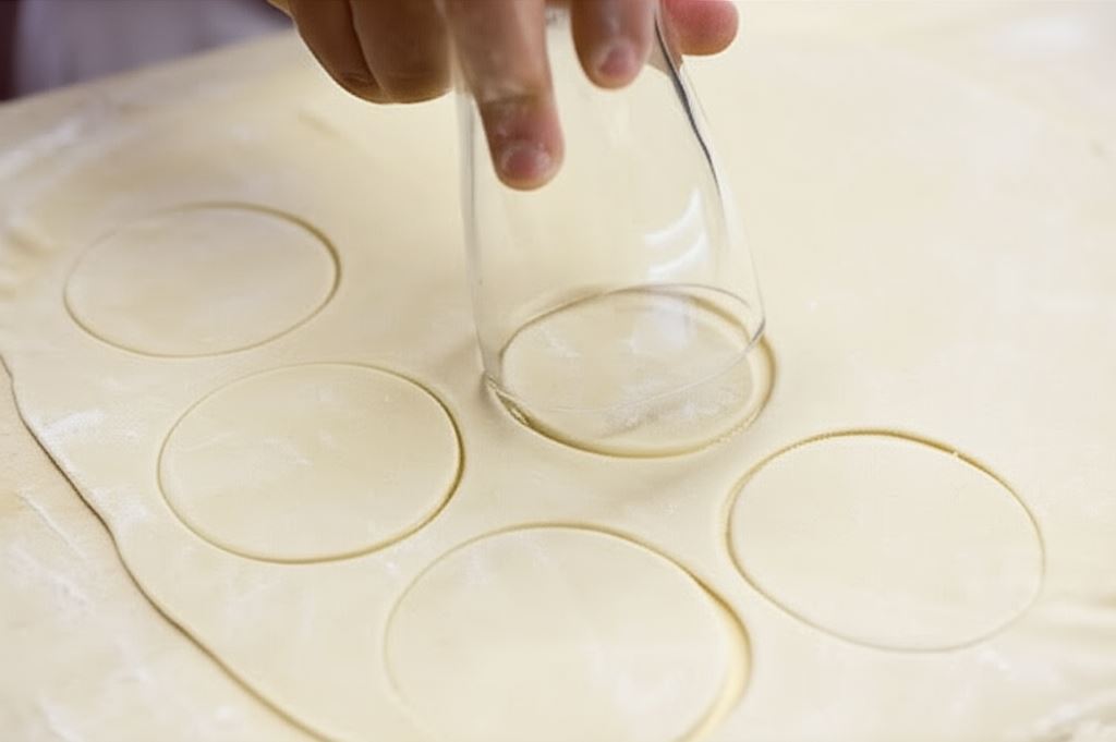 Potem podziel ciasto na porcje i każdą z nich rozwałkuj na cienko. Za pomocą szklanki wytnij kółka.