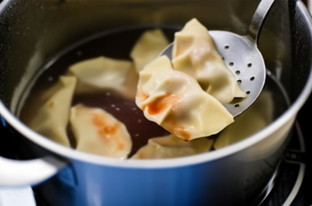 Uformowane pierogi wrzucaj delikatnie do osolonej wrzącej wody, wyciągaj łyżką cedzakową po 2-3 minutach od czasu wypłynięcia.