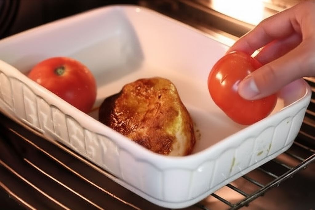 Opłucz pomidory. Dodaj je do naczynia z kurczakiem i zapiekaj wszystko razem.