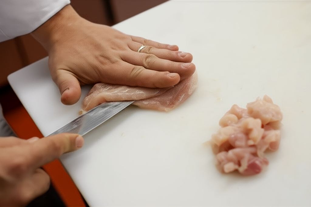 Z piersi wykrój niewielkie filety, jedną połowę posiekaj w drobną kostkę. W pozostałych filetach wykonaj kieszonki.