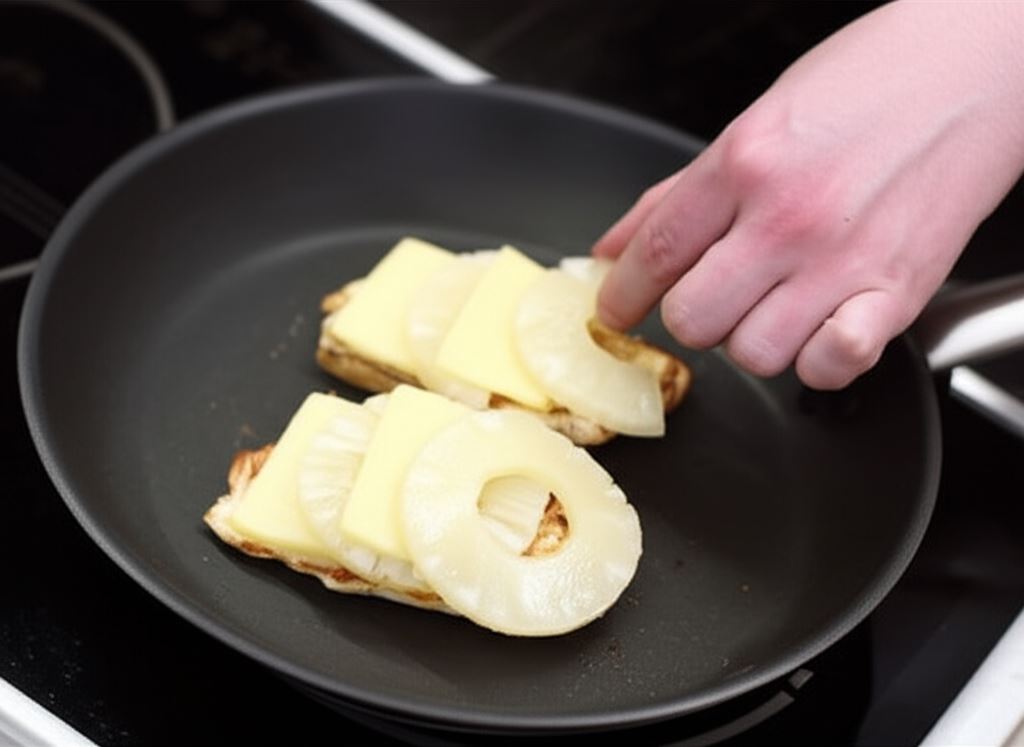 Obsmażaj piersi z dwóch stron, połóż na nich po plastrze sera i ananasa.