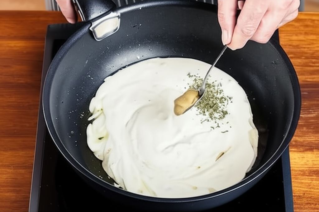 Do tej samej patelni dodaj śmietanę, musztardę i estragon. Wymieszaj starannie aż składniki się połączą. Zagotuj całość.