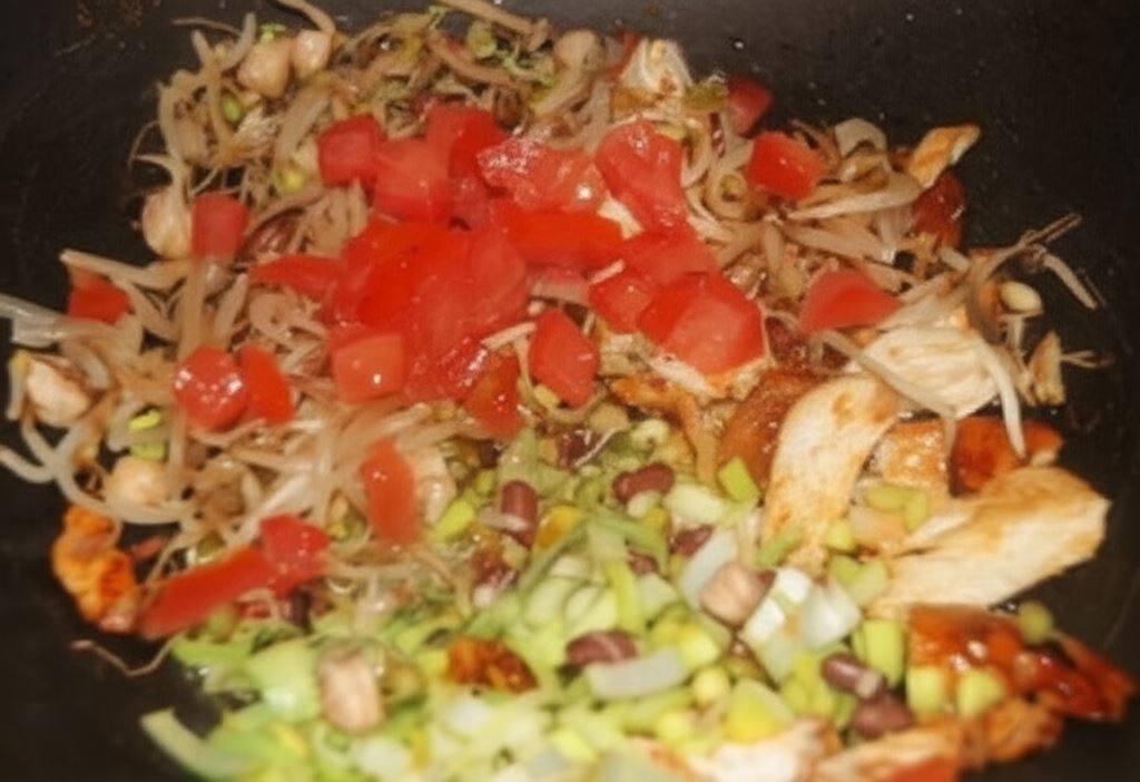 Delikatne paski kurczaka, aromatyczne kiełki i odrobina pikanterii – to przepis, który przeniesie Cię w kulinarną podróż po Azji! Nasze danie łączy w sobie chrupiące warzywa, soczyste mięso i wyraziste przyprawy, tworząc harmonijną kompozycję smaków.