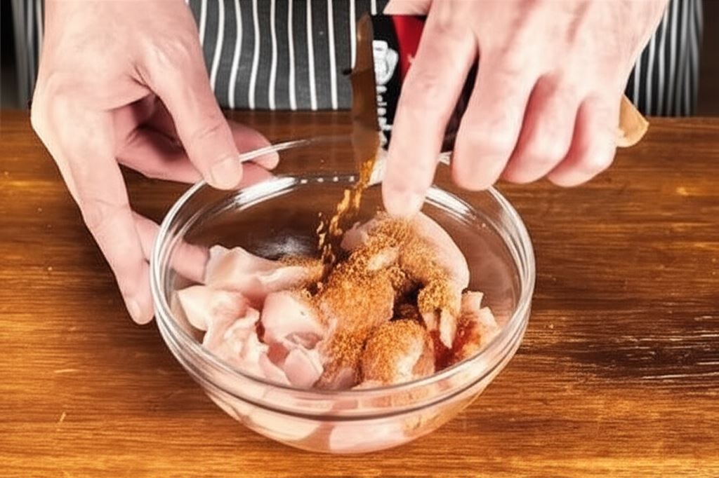 Kurczaka pokrojonego na grube kawałki posyp hojnie Przyprawą do mięs z papryką Knorr. Pozostaw na parę godzin w zimnym miejscu.