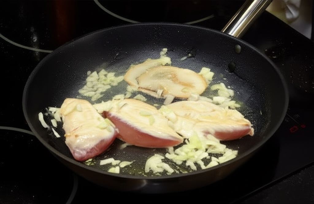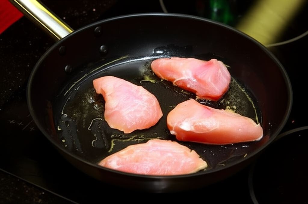 Przetnij każdą pierś z kurczaka na ukos przez środek i obsmaż na patelni aż mięso nabierze rumianego koloru.