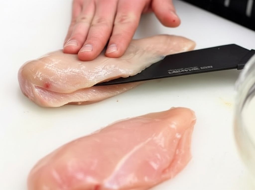 Filety z kurczaka oczyść z fragmentów tłuszczu. Wykonaj w nich nacięcie od górnej części piersi na całej długości, formując kieszeń.