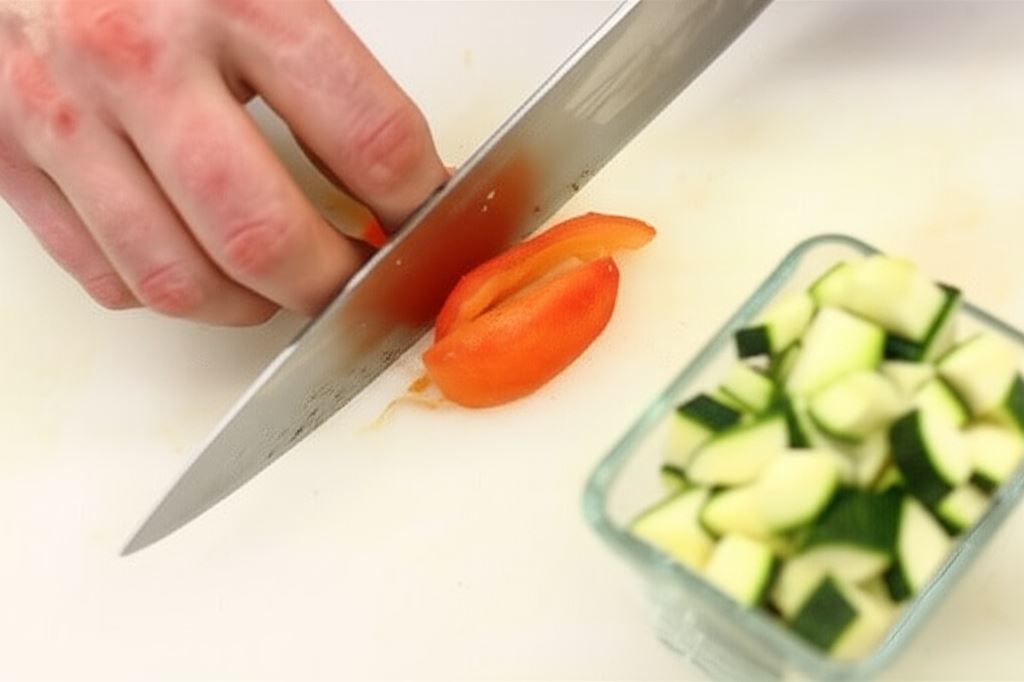 Obierz cukinię ze skórki, wydrąż gniazda nasienne, a miąższ pokrój w większą kostkę. Pomidory sparz, zdejmij skórkę i pokrój na cząstki.