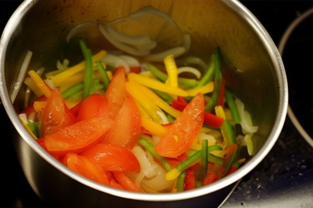 W dużym rondlu podgrzej olej, wsyp cebulę i zeszklij ją. Wsyp przygotowaną paprykę i pomidory. Gotuj je aż do momentu kiedy pomidory się rozpadną, a papryka stanie się miękka.