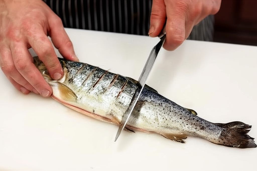 Pstrągi opłucz, wytnij oczy, natnij grzbiet do kości.