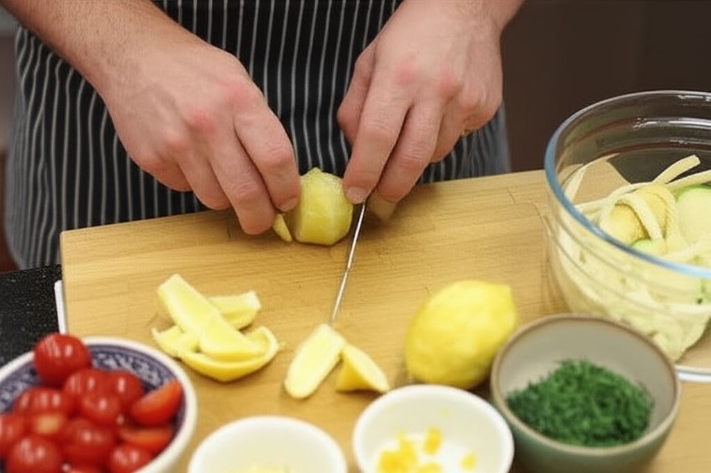 Cukinię, fenkuł i ziemniaki potnij w plastry, posiekaj natkę kopru i czosnek, pomidorki przetnij na połówki. Zetrzyj skórkę z cytryn, a potem jedną cytrynę obierz z białej warstwy i pokrój w plastry.