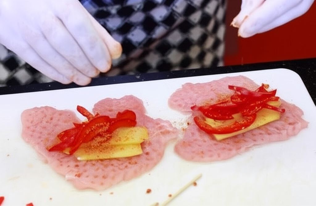 Na każdy kawałek mięsa połóż plaster sera i pasek papryki. Potem posyp wszystko ostrą papryką, złóż na połowę i zepnij wykałaczką.