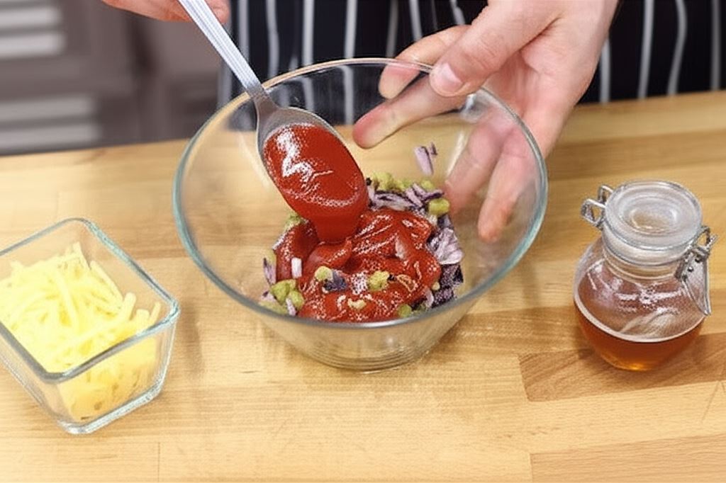 Cebulę i ogórka posiekaj w małą kostkę i połącz z ketchupem oraz miodem. Ser zetrzyj na tarce.