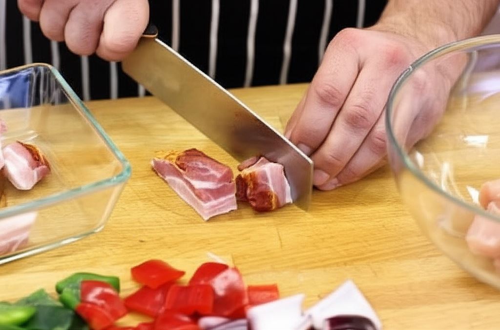Piersi opłucz, wysusz i potnij w grubą kostkę o wymiarze około 2 cm. W podobny sposób potnij warzywa i boczek.