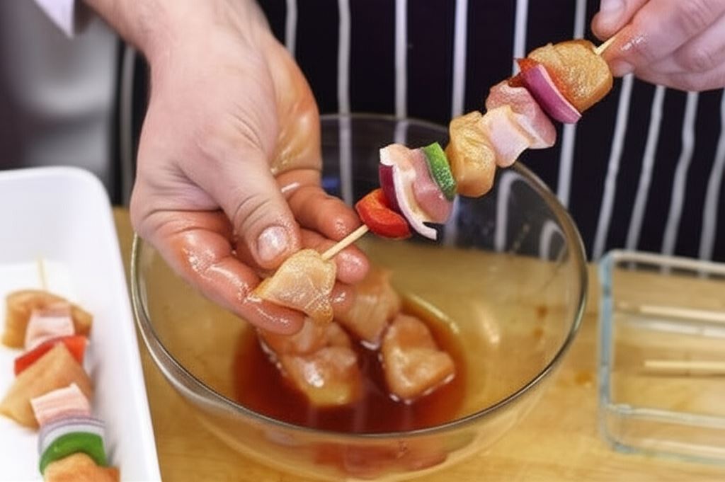 Zamarynowane mięso, pokrojony boczek i warzywa nabijaj naprzemiennie na drewniane patyczki szaszłykowe. Uprzednio zamocz patyczki na parę minut w wodzie. Dzięki temu nie będą się przypalały w trakcie smażenia.