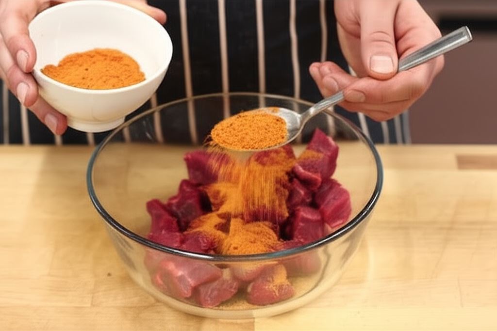 Mięso potnij na grube kawałki około 2 x 2 cm. Posyp lekko przyprawą Knorr i odstaw na bok.