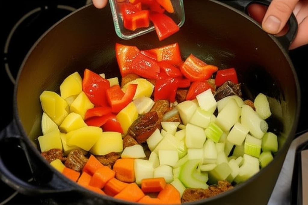 Wsyp selera, cebulę, ziemniaki, marchew, paprykę. Warzywa podsmażaj przez dłuższą chwilę aż się zarumienią. Wlej dwie szklanki wody i całość gotuj pod przykryciem około 15 minut, dopóki ziemniaki nie staną się miękkie.
