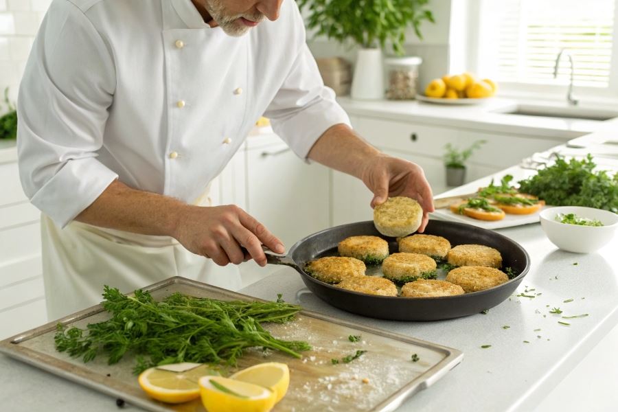 Panierowanie kotletów szczupakowych wymaga trzech oddzielnych stacji: mąka pszenna, roztrzepane jajka z dodatkiem soli, oraz panierka. Najlepszą panierkę stanowi mieszanka bułki tartej z dodatkiem sezamu lub płatków kukurydzianych (proporcja 3:1), która zapewnia wyjątkową chrupkość. Każdy kotlet należy dokładnie obtoczyć w mące, strząsając nadmiar, następnie zanurzyć w jajku i dokładnie obtoczyć w panierce, delikatnie dociskając.