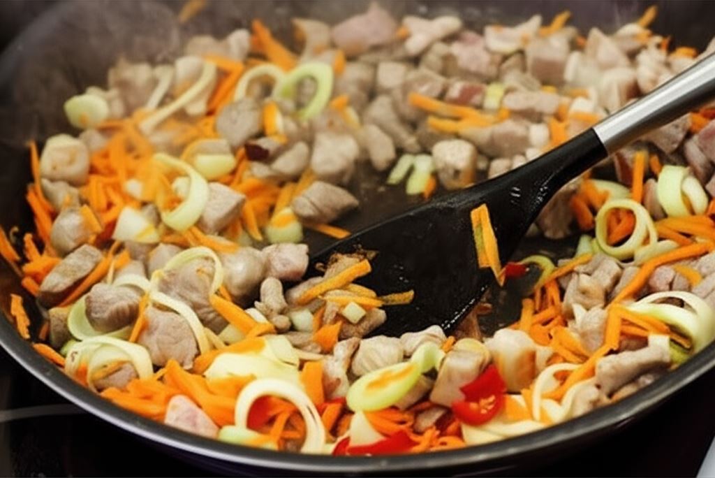 Na patelni przysmaż mięso jagnięce – powinno być chrupiące. Dodaj do niego cebulę, marchew, czosnek, pora i ostrą paprykę. Smaż do momentu, aż składniki niemal całkowicie się usmażą.