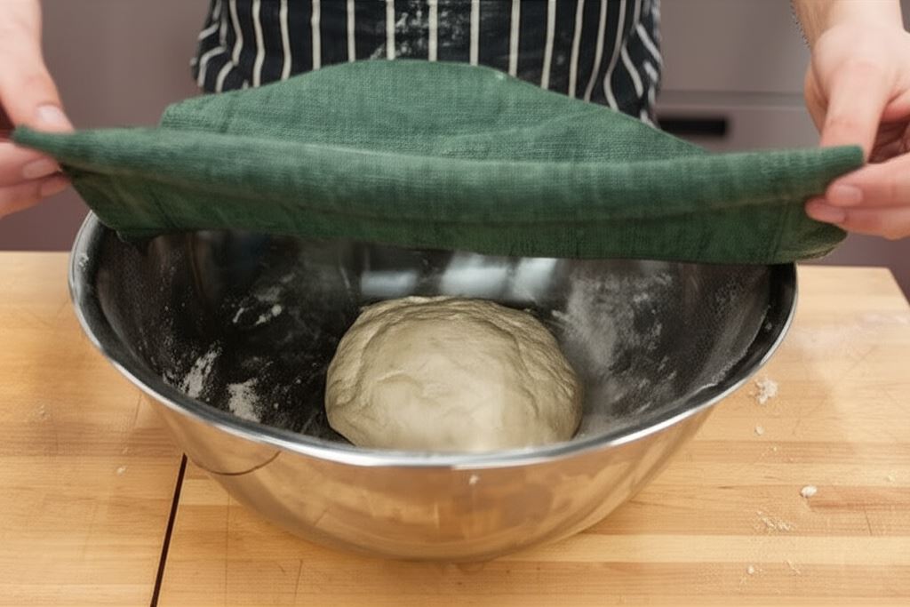 Wszystkie składniki na ciasto połącz razem dokładnie wyrabiając. Przygotowane ciasto nakryj czystą płócienną serwetką i odstaw na 40 minut w ciepłe miejsce aby ciasto zdołało wyrosnąć.