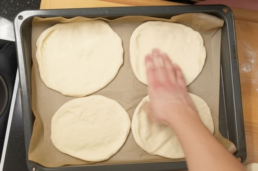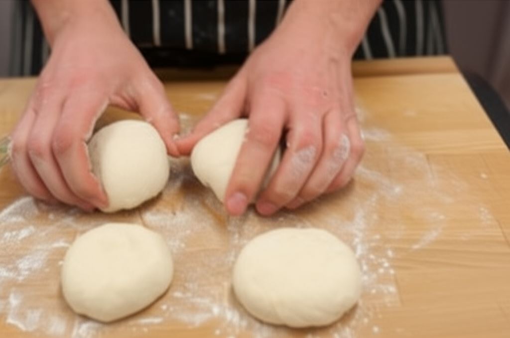 Po tym czasie ciasto ponownie wyrób dłonią, dosyp nieco mąki i rozdziel na 4 do 6 kul o identycznej wielkości.