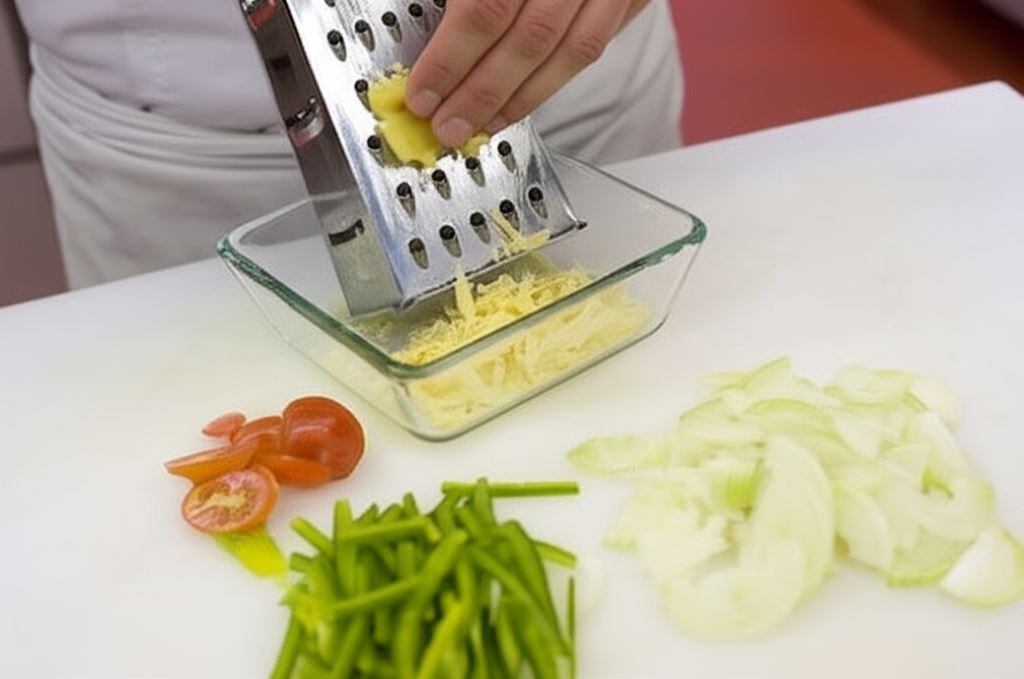 Ser zetrzyj na grubych oczkach, cebulę pokrój w półkrążki, pomidory w plastry, paprykę w paski.